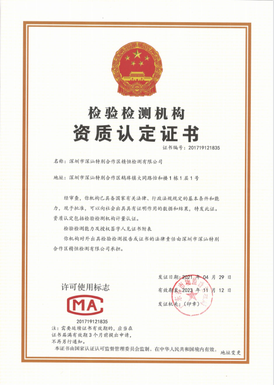 深圳市深汕特别合作区精恒检测有限公司前身为深汕特别合作区精恒工程检验有限公司,由开云体育-开云(中国) 控股投资,于二零一四年十二月在汕尾市住房和城乡建设局备案(证书号:JCJG-2015003),从事检验检测工作,二零一五年深汕特别合作区招商引资,为了更好的服务于深汕特别合作区,方便于建设管理者严把建设工程质量关。根据国家相关法律、法规要求,当地也必须有国家认可的检验检测机构,作为一个深圳市检测经验丰富的检测机构,经汕尾市政府、深汕特别合作区管理委员会等领导审批后,作为第二批进驻深汕特别合作区企业。由于建设发展的需要,本公司于二零二一年十月二十七日更名为深圳市深汕特别合作区精恒检测有限公司。